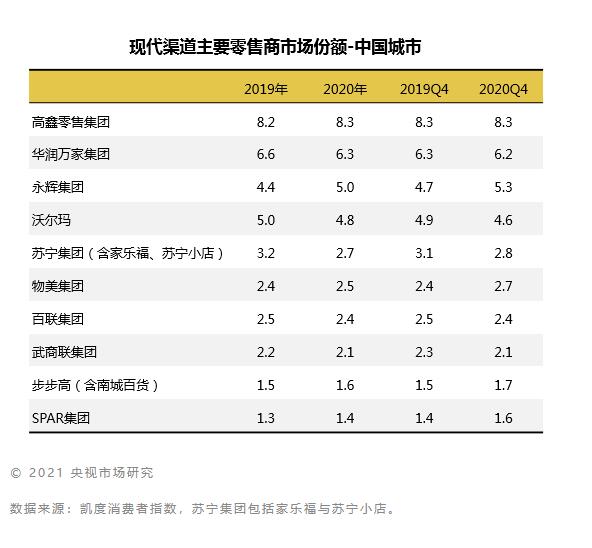 2020年主要零售商的表现继续分化,永辉集团超越沃尔玛,已经成为排名第三的零售商,在四季度份额达到新高。2020年12月19日,永辉正式进入千店时代,通过全国化的布局,深耕核心区域,巩固福建,重庆,四川,北京等省市的区域优势,积极渗透下沉市场。高鑫零售集团维持了市场领先的地位,在数字化改造和新业态的探索下,全年市场份额较2019年略有提升。在疫情防控常态化的背景下,区域零售商中物美,SPAR和步步高通过快速的数字化转型,积极推进O2O业务和会员运营体系及供应链的深度建设,并加大全国市场的探索力度,逆势增长,份额均有明显上升。