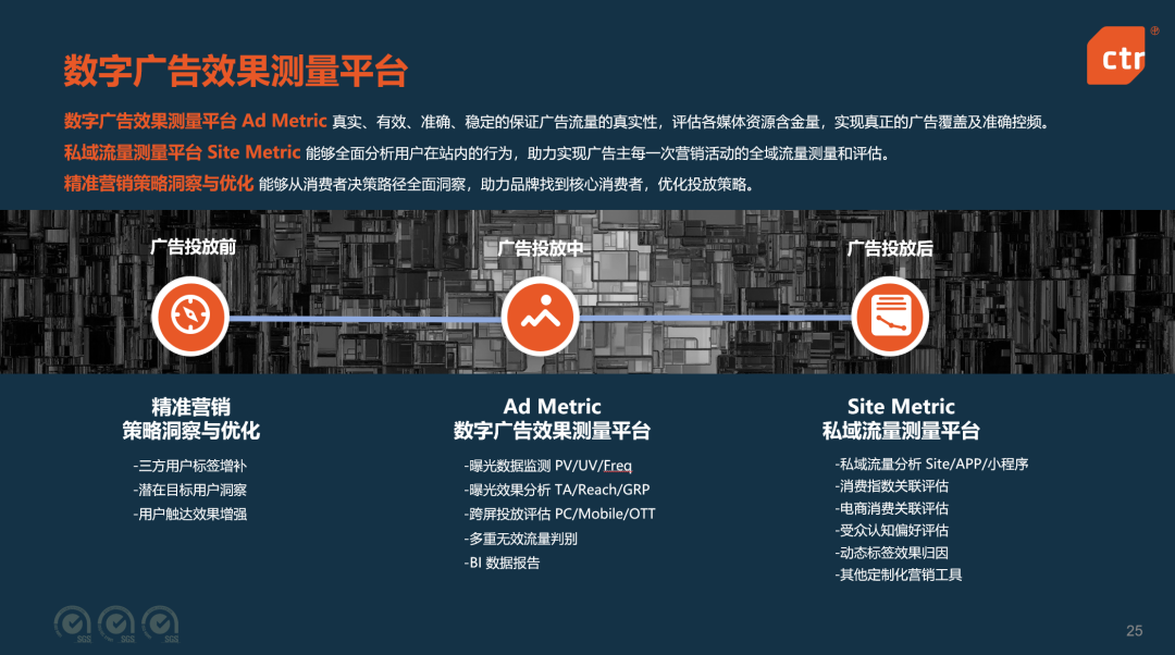 今天的CTR拥有数字广告效果测量平台 Ad Metric、私域流量测量平台 Site Metric两大平台工具。